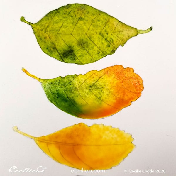 Step 1: Leaf one. Blending watercolors to create colorful leaves