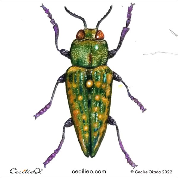 And that, dear fellow artist, is how you draw a realistic jewel beetle with colored pencils. Don’t forget to look for more art ideas for colored pencils from the world of beetles!