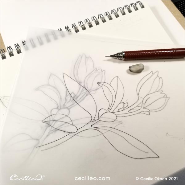 This flower has a rather ornamental look. Drawing the flower, I found myself in an almost decorative drawing mode. The simple outline captures the basic shape. You are welcome to download the outline for free if you are not up to drawing it yourself. Learn how to transfer the drawing onto watercolor paper.